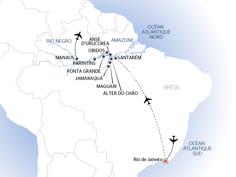 le vol Paris(1)/Rio et Manaus/Paris - les taxes aéroport (163 € - tarif 2025) -– le vol(1) domestique Rio/Santarem - les taxes d’aéroport (10 € - tarif 2025) - les transfert mentionnés au programme – la demi-pension en hôtel 4* NL à Rio du J1 au J4 - les déjeuners des J2, 3 et 4 - la croisière en pension complète du dîner du premier jourSpaceau petit déjeuner buffet du dernier jour - les boissons incluses à bord (hors cartes spéciales) - le logement en cabine double climatisée avec douche et WC - les visites mentionnées au programme - les services d’un guide conférencier naturaliste - le cocktail de bienvenue - la soirée de gala - l'assurance assistance/rapatriement - les taxes portuaires.